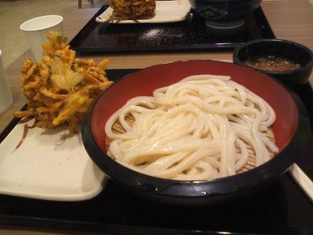 ざるうどんとカボチャのかき揚げ。